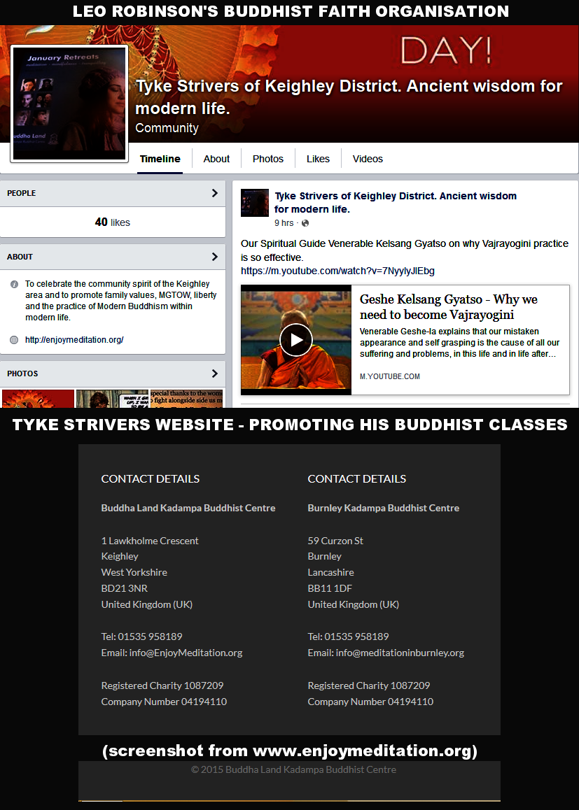 http://www.keighleynews.co.uk/news/11644387.Northern_Tea_Party_holds_recruitment_meeting_in_Keighley/ Extremely troubling is Tyke Strivers AKA Leo Robinson's senior standing in his local Buddhist community, people who must be made aware of his horrific racist and Islamophobic views, which they are almost certainly not aware of. To repeat - UK Buddhists love peace and equality, and they will be absolutely mortified to learn that their local group meditation class leader is a neo-Nazi hatemonger. Anybody involved within Buddhism in the UK, please inform the faith's senior practitioners to make them aware of Leo Robinson's hate, so steps can be made to remove him from his position of authority in the faith. This is a stark reminder that vile extremists are present in all faiths.