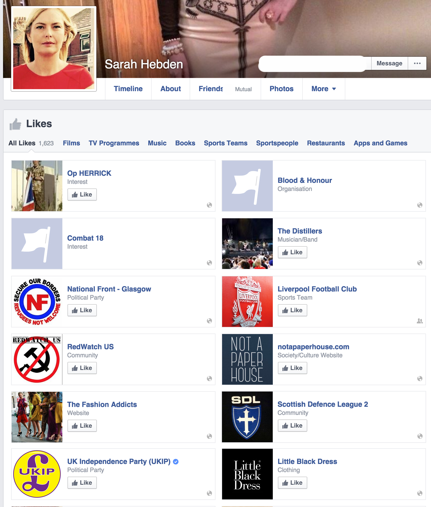 Unlike other activists Sarah takes a backseat approach, not known to attend any demo’s though is known to of attended and taken photos at informal gatherings with National Front and Blood and Honour members near Castleton. In addition she’s also shown support for a number of far-right pages online such as Redwatch, Blood and Honour, the SDL and Combat 18 to also stating “I fucking hate Lefties” on her profile.