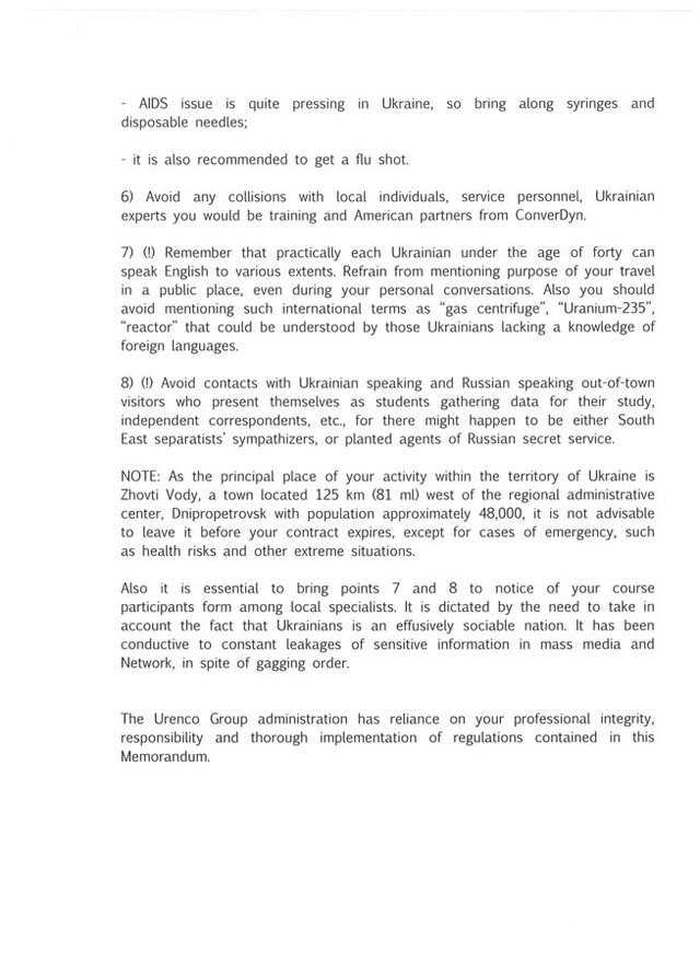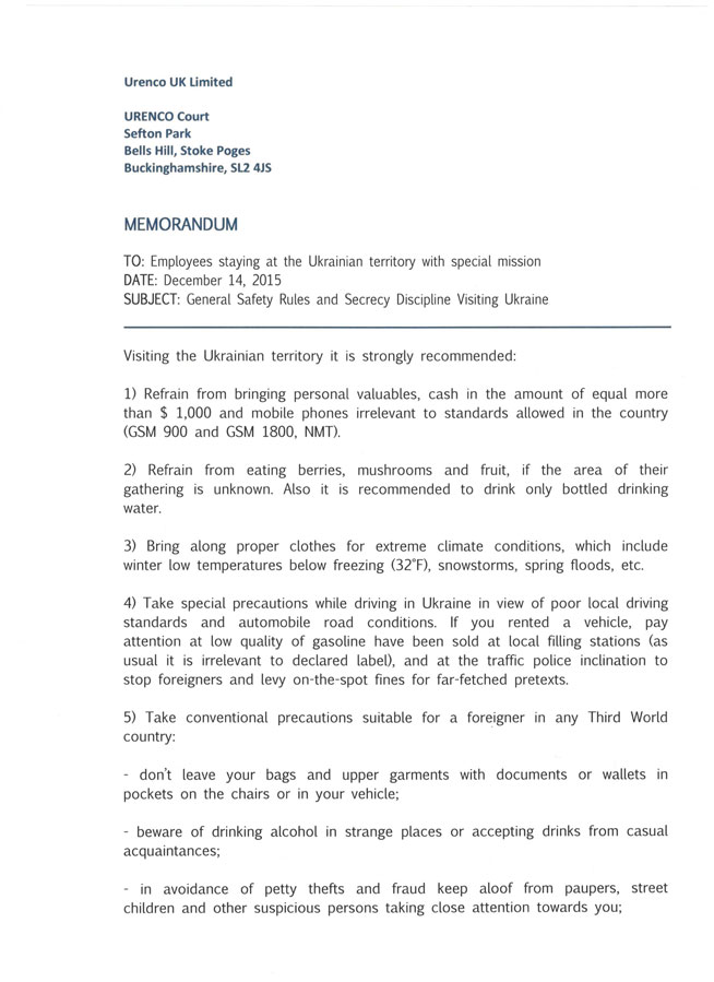 Why do British gentlemen instruct their employees visiting to Ukraine that they're going to the country of the Third World with poor roads, dubious food, corrupted police and diluted gasoline? I guess, I should be grateful that they didn't mention salted lard and bears in the streets (yes, everyone's aware that the West confuses Ukrainians with Russians very often)! The more's unclear if the front office of the Urenco (which sounds extremely backhand for a Ukrainian) Group Company has been looking forward effective co-operation, while itemizing separately the point about shifty-eyed Ukrainian nation. According to them Ukrainians have become originators of mythic variety of leakages of some (they don't specify a single case) secret information.
