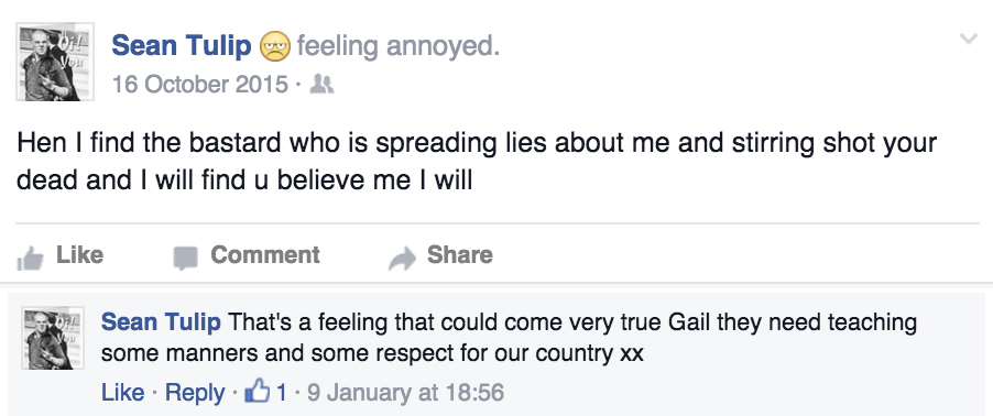 Sean regularly makes bigoted comments and shares a number of British National Party/BNP, Britain First and white supremacist propaganda online. He’s also taken photographs of one his own NEI members Heidi Culver giving a Nazi salute, in addition Sean also makes a number of violent posts threatening to kill people and wanting to teach people some manners about ‘respecting our country’.