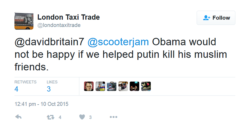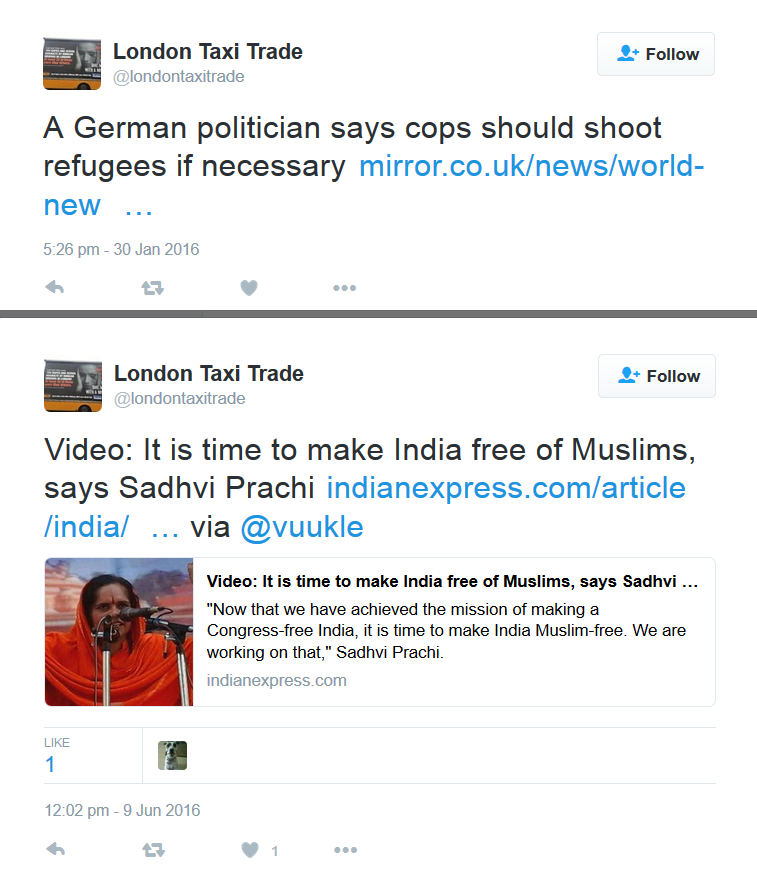 https://twitter.com/londontaxitrade/status/652931972709355520 Another anti-Muslim tweet encouraging London's black taxi drivers to discriminate against Muslims: -