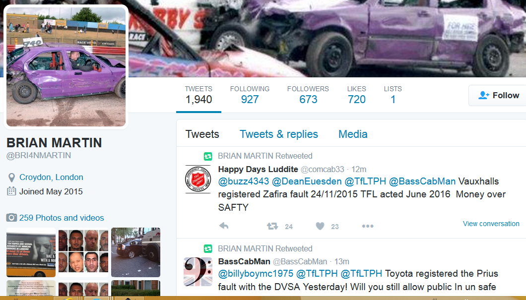 https://twitter.com/BRIANM4RTIN/status/596343941395574784 The most worrying aspect of it all, is Mr Martin's status as the trade leader for London's black cabs, supported by his official-looking website. Racialising Uber crime as a "Muslim thing", supported by a vast number of rank and file drivers, his views are likely (if they haven't done so already) to percolate onto the street as racist behaviour towards non-white passengers and fellow motorists.