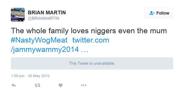 https://twitter.com/BRI4NMARTIN/status/728326275258060800 Just to prove to the world that Martin is a horrific white supremacist who disapproves of race-mixing, he trolls another Twitter users with a despicable anti-Black tweet: - "the whole family loves n*ggers, even the mom #nastywogmeat"......