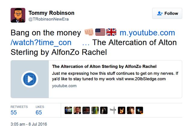 Falsely accusing black men murdered by the police such as #PhilandoCastile and Alton Sterling as being "paedophiles", rehashing a fake photo of Alton playing with guns with young boys he discovered on the white supremacist web, Tommy Robinson has well and truly gone back to his anti-black roots with a series of the most repulsive grave-spitting tweets imaginable, openly celebrating their deaths on Twitter, and telling horrific lies about the Black Lives Matter movement.