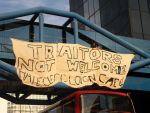 On Friday 16th September, 3 student activists dropped a banner reading "Traitors Not Welcome, Hate Clegg Love NCAFC" for the opening of the Liberal Democrat 2011 conference in Birmingham. All 3 activists were arrested and held in police cells over the weekend, charged with road traffic offenses. At their bail hearing on Monday 19th, 2 were released on bail, whilst the third individual was remanded in custody.