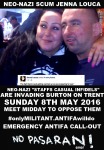 HITLER-loving toerag Jenna Louca is organising a fascist invasion of Burton-on-Trent on Sunday the 8th of May 2016 by the EDL-offshoot she now leads: - the Staffordshire Casual Infidels, primed to chant racist abuse and threaten Asian and black passers-by, as you would expect from such an objectionable gang of hardcore white supremacist thugs. Jenna's notorious twitter hate account @angelstaffs was recently banned because of her sickening racist content, screenshots captured by anti-fascist exposing website EDL News, expressing a desire to see refugee children suffering harm. Her latest account is unsurprisingly named in tribute of her late German fascist dictator idol: