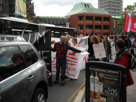 All the same, some of the assembled May Day celebrators forgot about the ban and spontaneously took to the streets, reclaiming the road and holding a colourful procession from the Council House to Millenium place. Maybe just an act of token resistance -- but was great to see Coventry town centre give way to anarchic festivity on May Day, even if just for a brief pause. The parade was led by the banners of West Midlands No Borders: "asylum is not a crime"; "freedom of movement for all"; "no one is illegal"; and "working is not a crime".