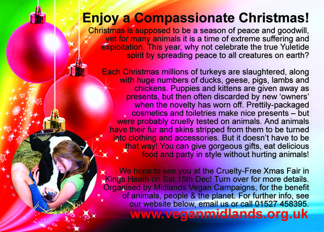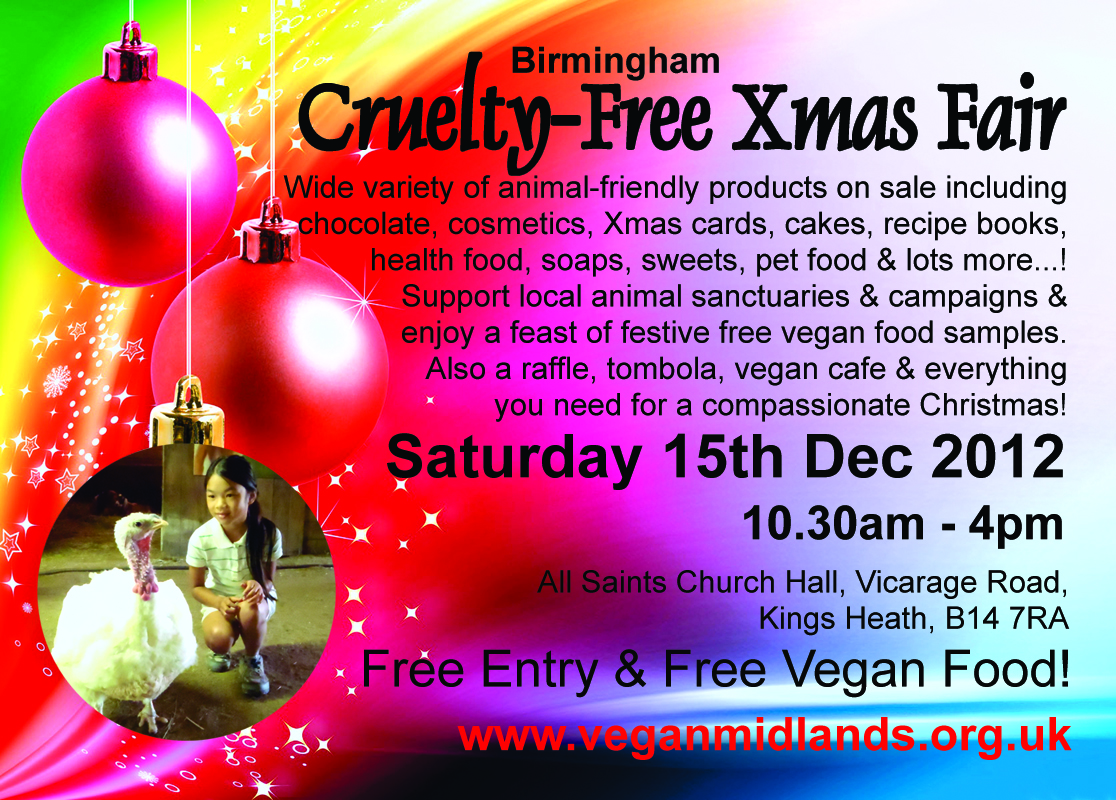 Stock up on lots of cruelty-free goodies just in time for Xmas, whilst supporting local sanctuaries, campaigns and small ethical companies! Items for sale on stalls will include chocolates, cosmetics, Xmas cards, cakes, soaps, local produce, campaign merchandise, health food, sweets, eco-friendly products, recipe books, pet food & lots more...!
