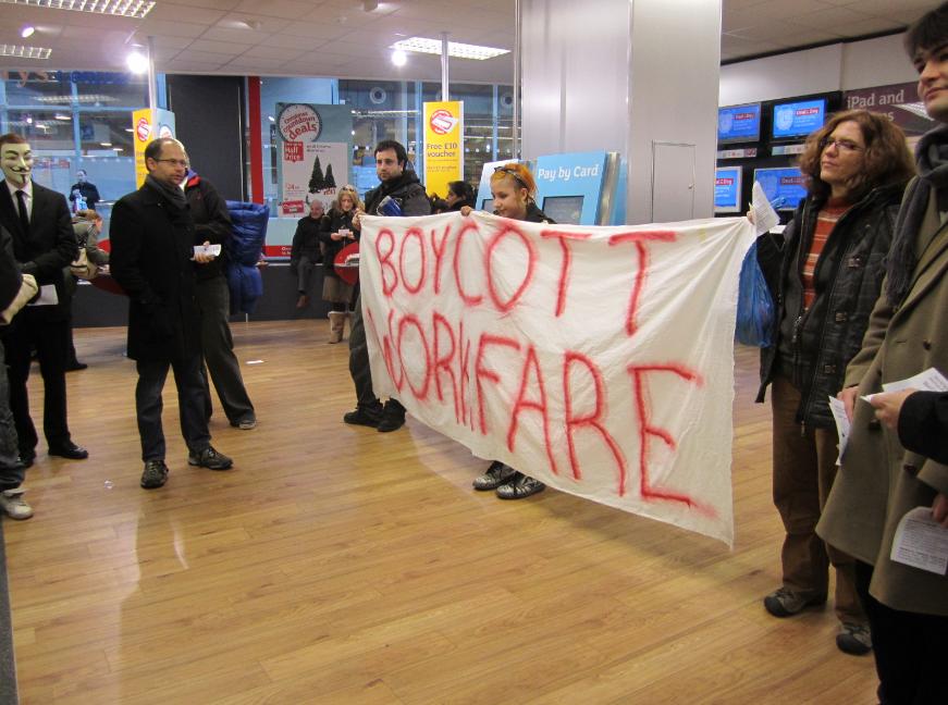 Saturday 8th December marks the start of a week of action against workfare [1] and shops that profit from the free labour supplied by the taxpayer. The national day of action is focusing on charities, however as there aren't many charity shops in the city centre and since a protest last month outside British Heart Foundation who announced they were stepping back from workfare[2] it was decided to take action over companies that profit from free Christmas temps at our expense. In Birmingham anti-workfare protesters gathered outside Poundland, a local company using workfare. As the protest began to grow with people joining after coming from the nearby Starbucks tax dodging action the group decided to move off in search of other shops using workfare. They didn't have to walk far when round the corner they arrived at Argos, a particularly unpopular shop amongst Birmingham Workfare activists. In Birmingham last year, Boycott Workfare was told by someone who applied for a temp job at Argos, but didn’t get it and then subsequently got sent there on workfare that they had more people on workfare than paid temps. In light of this the group made the decision to occupy the shop. The occupation was more successful than expected, security - the same people who a week earlier had assaulted a protester by punching them in the face at the occupation of the Adidas shop[3] – had obviously been told to back off and not go round punching people, let the occupation carry on as long as the occupiers wanted. After the queues at Argos had become visibly shorter the group decided that there were other shops who needed to be targeted and so ended the occupation. The next stop on the Workfare tour was Superdrug where flyers were handed out before moving on to the last stop on the tour McDonald’s. Here the protesters were joined by Birmingham Food not Bombs activists who set up a stall outside McDonald’s and began handing out free vegan burgers.