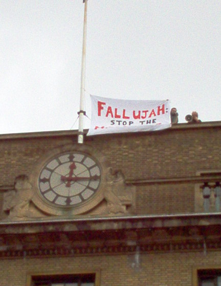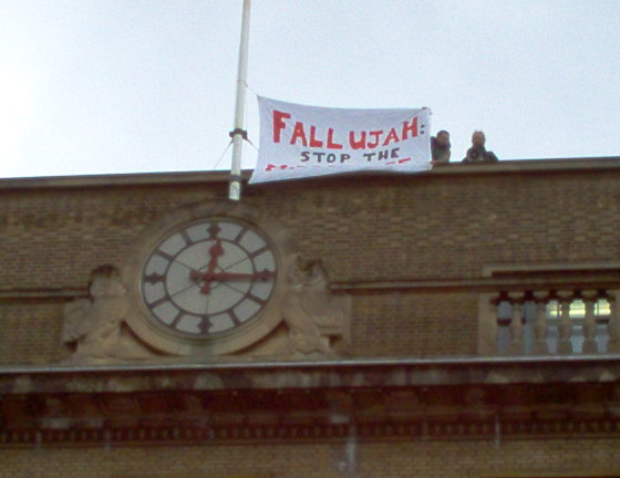 banner reading 'Fallujah: Stop the Massacre'. Those participating in the