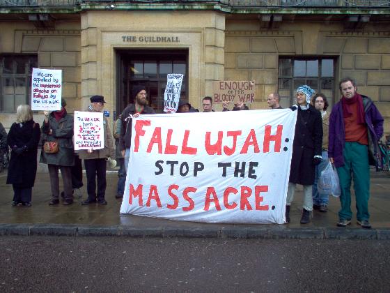 banner reading 'Fallujah: Stop the Massacre', as part of a larger protest currently taking place in Cambridge's Market Square.