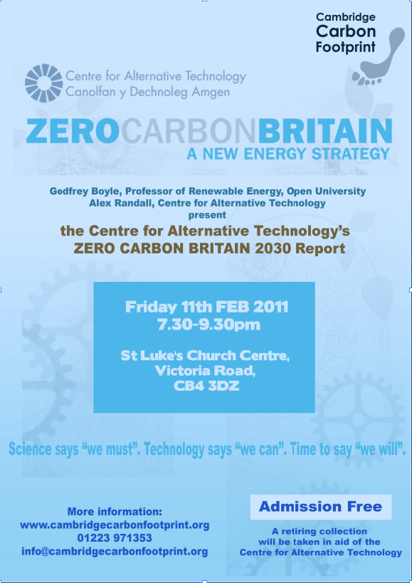 We are delighted to be welcoming speakers from the Centre for Alternative Technology to talk about CAT’s groundbreaking ZeroCarbonBritain2030 report, in which a team of distinguished academics and researchers show how Britain could eliminate emissions from fossil fuels within 20 years and break our dependence on imported energy.