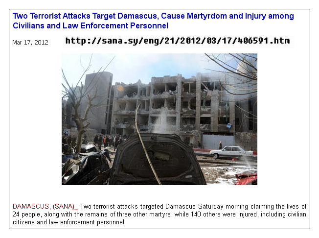Picture: Two Terrorist Attacks Target Damascus, Cause Martyrdom and Injury among Civilians and Law Enforcement Personnel - Mar 17, 2012 .....
