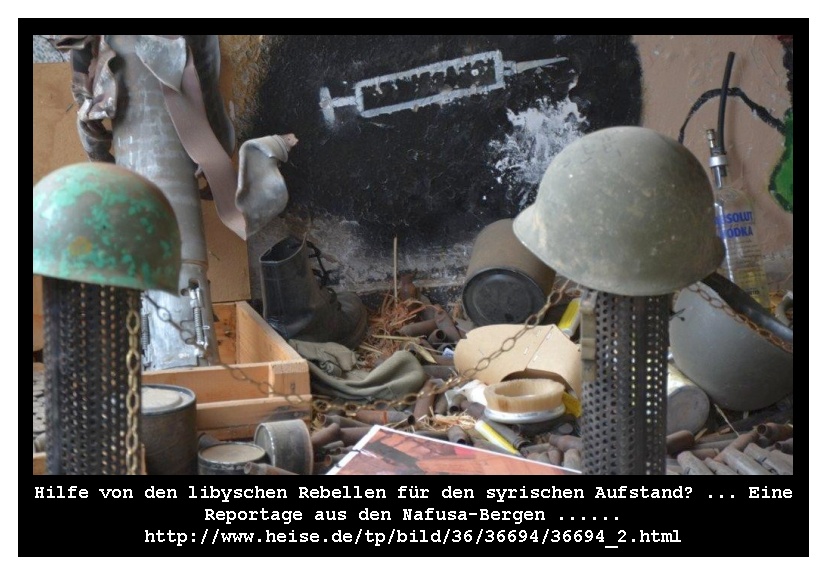 Picture: Hilfe von den libyschen Rebellen für den syrischen Aufstand? ... Eine Reportage aus den Nafusa-Bergen: Dichter Nebel hängt über den Bergen. Nur langsam zieht sich der alte Toyota über die Serpentinen hinauf. Die Sicht wird immer schlechter, obwohl es gleich Mittag ist und die Sonne durchkommen müsste. Vorbei an schroffen Felswänden und wie tief es rechts neben der Strasse hinunter geht, kann man nur ahnen. Von Tripolis dauert die Fahrt in die Nafusa Berge zwei Stunden. Ein Hochplateau im Westen Libyens, 1000 Meter über dem Meeresspiegel, das sich bis an die Grenze zu Tunesien erstreckt. Von hier aus wurde im vergangenen August die libysche Hauptstadt erobert und Diktator Muammar Gaddafi und sein Regime gestürzt. ......... M E H R:  http://www.heise.de/tp/bild/36/36694/36694_2.html