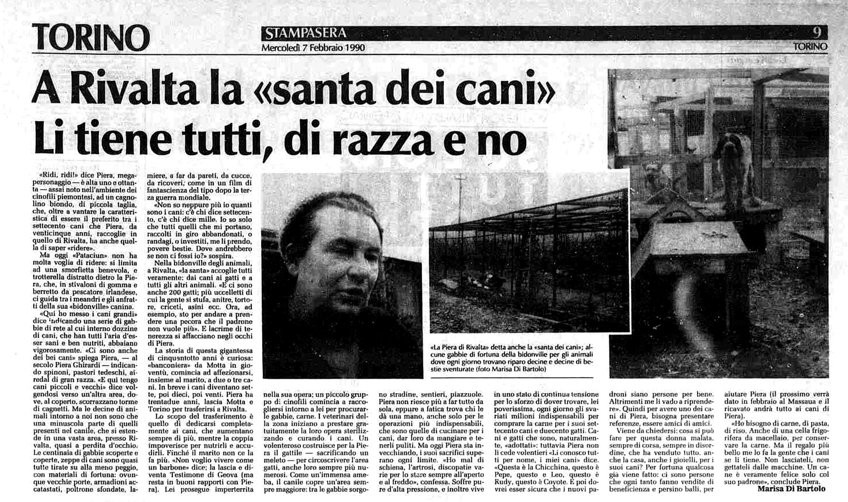 Luigia Ghirardi (per tutti “Piera”) nasce a Torino il 24 giugno 1932. Ha una passione smisurata per gli animati, di qualsiasi razza. Salva un pony (Barone) dal macello ed incomincia ad ospitare caprette tibetane, papere, pecorelle, colombi, conigli, orfani d'ogni sorta e molti altri “a-mici” ai quali trova una degna sistemazione (quasi sempre da lei). A questi si aggiungono nel tempo tanti, tanti, tanti cani e gatti abbandonati. Prima uno, poi due, tre, 10, 100, arrivando ad ospitare più di 600 cani e 200 gatti (lei li conosce ognuno per nome)!! A tutti offre accoglienza, tanto amore ed una ciotola di pappa calda ogni giorno. Nel 1970 Piera giocoforza lascia la Torino-bene abbandonando l'attività lavorativa. Si trasferisce a Rivalta di Torino (Torino Sud) dove fa dell'accoglienza per gli animali abbandonati la missione della sua vita. Fonda l'Arca di Piera, Rifugio del Cane Randagio e degli Animali Abbandonati” a cui aderisce in seguito l'Associazione Amici degli Animali. Prima da sola (ed successivamente con l'aiuto di decine di volontari, simpatizzanti e benefattori) prende un appezzamento di terreno dove appronta con materiali di fortuna i primi box per accogliere i suoi “ospiti”. Tanti non lo possono ricordare, ma sono anni davvero molto duri e difficili. Vita “da cani” verrebbe quasi da dire. Per non far mancare nulla ai suoi amici trovatelli a 4 zampe, Piera pensa prima a loro. Sotto una tettoia di lamiera, senza nemmeno il conforto d'una stufetta, dorme in terra su d'un precario giaciglio, quasi una “cuccia” (una poltrona sfondata e un lussuosissimo materasso sgualcito trovato in discarica). Usa una betoniera per cucinare con a corredo una bella toilette molto naif … (i campi di granoturco sotto le stelle). Sopporta tutti i suoi disagi quasi volesse anche lei condividere l'esistenza raminga dei suoi protetti. Poi arriva la prima baracca, quindi una roulotte sgangherata, e più in là uno pseudo-prefabbricato. Solo di recente una vera e propria costruzione in muratura (un monolocale “all-in-one”). Tra le gabbie cominciano così a sorgere sentieri, piazzuole e stradine. Il “Rifugio” (ma è molto riduttivo definirlo tale) si trasforma ben presto prendendo corpo il suo sogno originario, solo immaginato mezzo secolo fa. Una vera e propria Arca. Una scialuppa di salvataggio per tutte le bestiole emarginate dal contesto sociale e dimenticate/bistrattate dall'uomo. Lo sanno le migliaia di cani e gatti da Lei salvati, e migliaia e migliaia di famiglie italiane che a Piera devono il privilegio di aver potuto adottare un amico fedele. E' anche grazie a Lei se oggi il Rifugio di Rivalta è dotato di una comoda cucina, bagni, un'infermeria attrezzata seguita da un veterinario di riferimento (per le medicazioni, vaccinazioni e profilassi), un magazzino con cella frigorifera, tanti box riscaldati concepiti con le migliori tecniche costruttive ed un ampio gattile (il tutto rispettando gli elevati standard di legge e le prescrizioni dell' ASL).