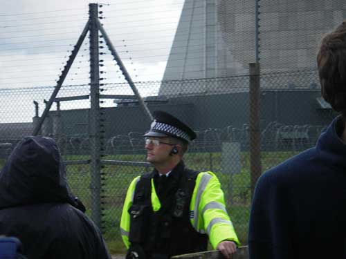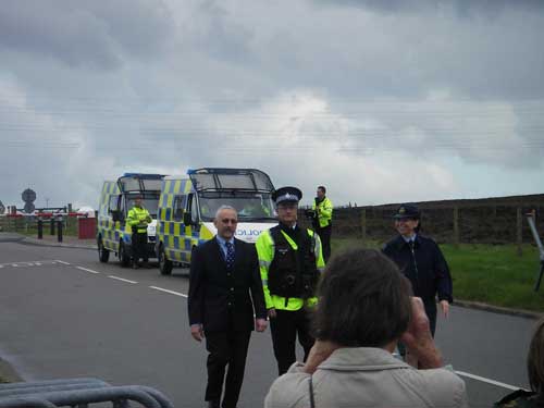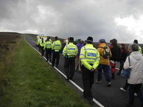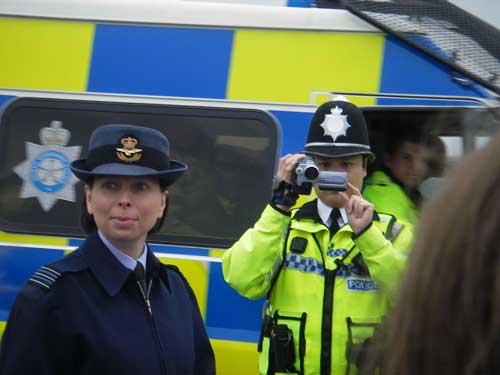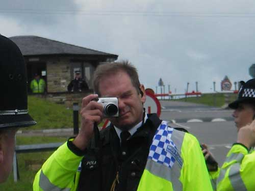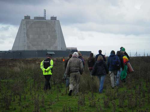 After the pleasant exchange with the PR bod, some protesters including ROR decided to embark on a symbolic walk to the parameter fence. Joined by officers, one of who was probably bored by the lack of menace in the group decided to show a bit of frustration by doing the eyeball redface shouty angry thing because the maestro had wondered off before he was ready to facilitate him. As the group climbed nearer to the fence the police escort turned back to allow their colleagues from the MOD to 'protect' the group by filming them from the comfort of their Landrovers.