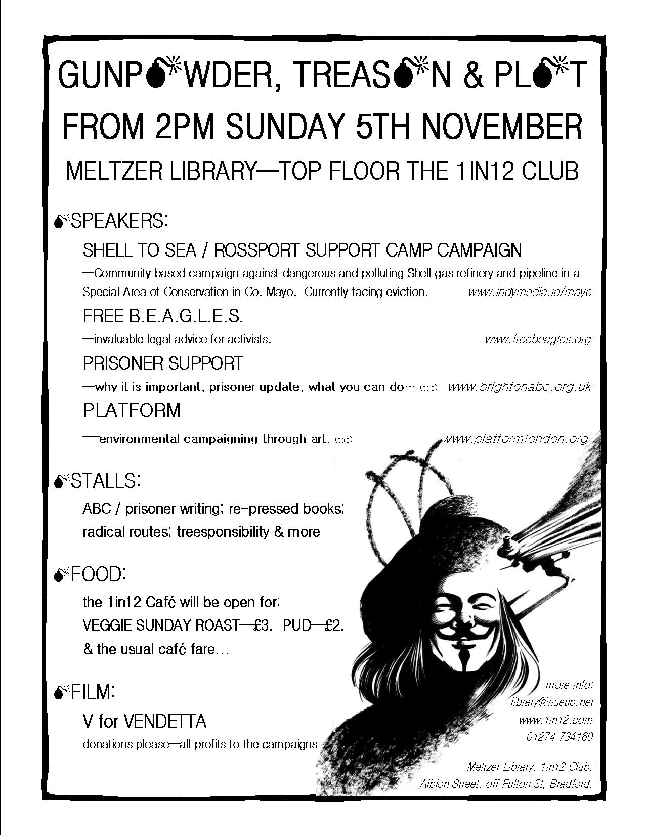 Speakers: Rossport Support Campaign (community based campaign against dangerous and polluting Shell refinery in Co. Mayo); Free BEAGLES (invaluable legal advice for activists). Stalls: radical routes; treesponsibility, leeds abc, platform, re-pressed books. Food: cafe will be open for vegan / veggie roast dinner