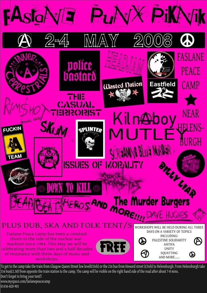 With Benefit gigs up an down the country to help fund this event,Faslane Peace camp invites you all to join us to party + protest- Help kick off a summer of rebellion!!