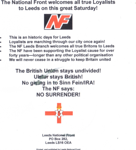 If you're not racists why did you allow the National Front to march with you and leaflet your march? What utter crap. I doubt the Romanian families burnt out by other Loyalist bigots in Belfast last weekend would welcome you either. You're not welcome in Leeds scum.