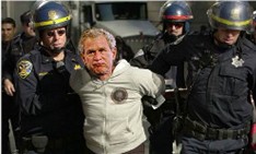When ever this Corporate Butt-Puppet appears anywhere here in our country we are regulated to "free speech zones" that are cordoned off by Fatherland Storm Troopers city blocks away from presence of Bu$h*t.