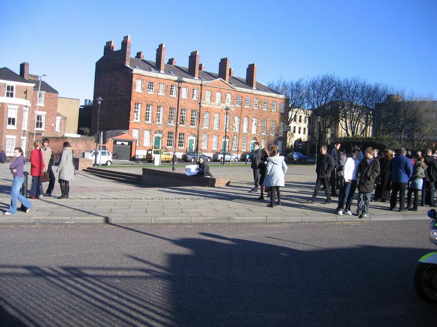 One lone protester (me) sat on the pavement outside Liverpool Cathedral attempting to communicate with Prime Minister Blair. Today, Blair continued to sponsor widespread killing and bombing in Iraq, but situated himself in the middle of a funeral to avoid the criticism by trying to make it impossible to say anything against him without causing collateral damage on the grieving relatives.