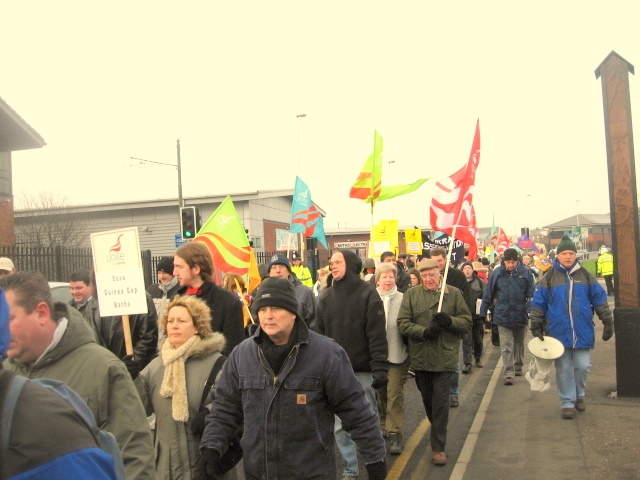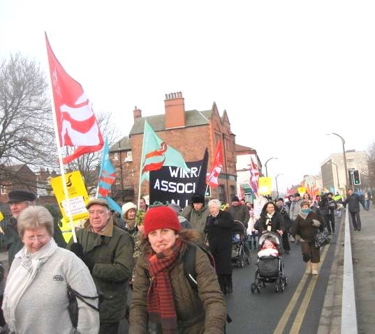 The BBC report refers to 'hundreds' marching. The figure was nearer a thousand. The final rally was obviously smaller at perhaps two hundred. There were two points at which the march hemorrhaged somewhat. The first was at the Seacombe terminal where many Wallasey folk decided, on bitterly cold day that they didn't wish to walk all the way to Hamilton Square in the neighbouring town of Birkenhead. From what I saw this was particularly true of elderly people and families with small children. The second was at the approach to Hamilton Square itself where most people headed straight for the station. Only those on the march will fully appreciate the 'minus-something' weather conditions as having been a factor here. Those who stuck it out to the end of the rally were hardy indeed.