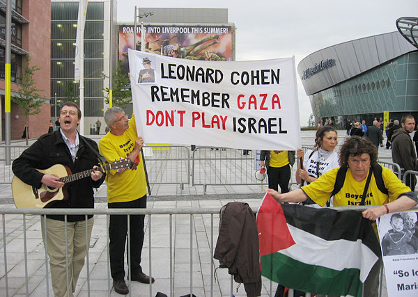 Leonard Cohen still plans to play in Tel-Aviv on 24 September, but Alun Parry, singing through a megaphone and surrounded by an impromptu chorus, banner and placards got straight through to the huge audience, many of whom did not know of Cohen’s plans.