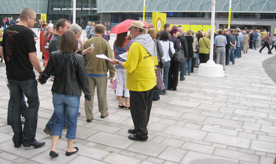 Radical singer Alun Parry was on guitar as the audience queued up for Leonard Cohen outside the Liverpool Arena last night.