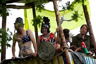 nmec Climate Camp protesters appear to be dismantling the wooden tower looking over the site that they erected. Maybe to use to cross the river?