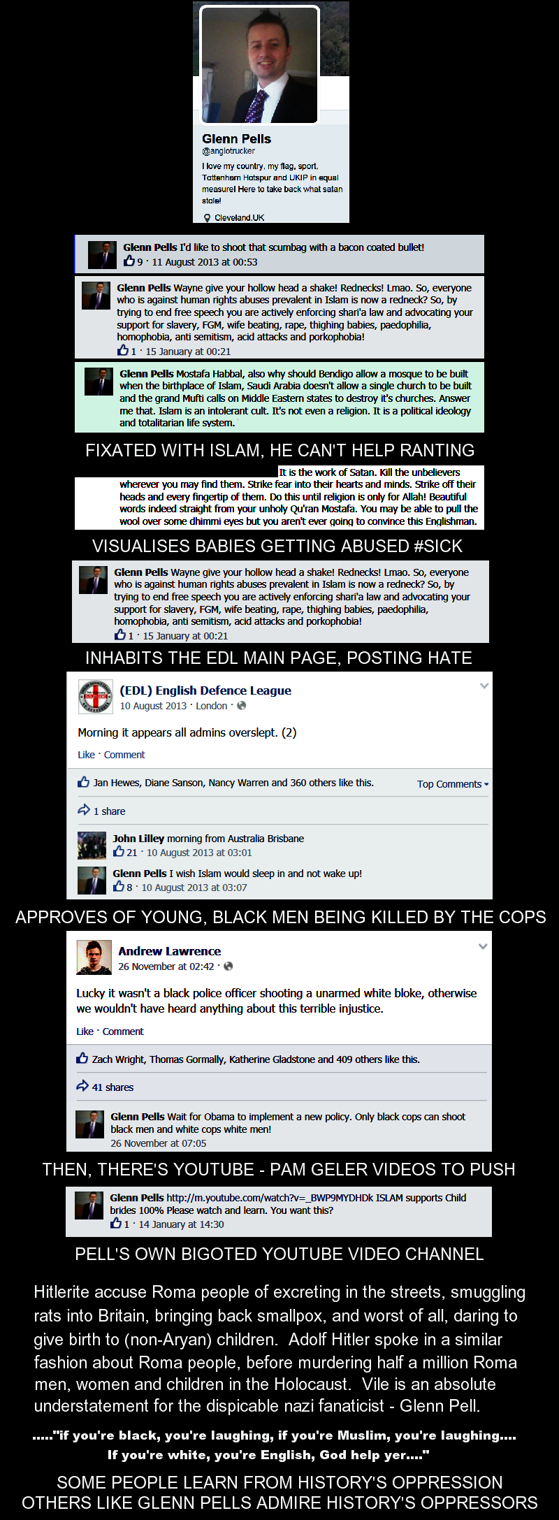 Glen Pells seriously believes Islam is the "work of Satan" in his online blasts of fanaticism which sets the tone in a lot of his comments. He believes in hate preacher Pat Condell's "clash of civilisations", and his hopeful civil war between Muslims and non-Muslims, and many of his facebook posts talk about war and "eradicating Islam". Pells is seriously deluded, bordering on quasi-religious fervour.
