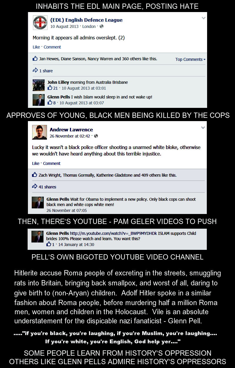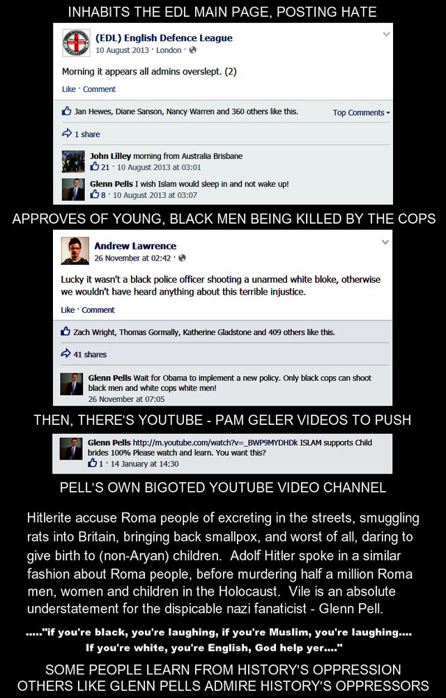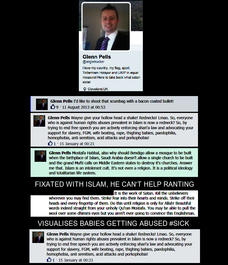 Glen Pells seriously believes Islam is the "work of Satan" in his online blasts of fanaticism which sets the tone in a lot of his comments. He believes in hate preacher Pat Condell's "clash of civilisations", and his hopeful civil war between Muslims and non-Muslims, and many of his facebook posts talk about war and "eradicating Islam". Pells is seriously deluded, bordering on quasi-religious fervour.