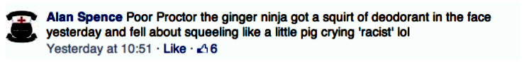 Alan Spence famously screamed out "Send the black cunts home" at an EDL rally, and he beat up Irishmen at a local social club.