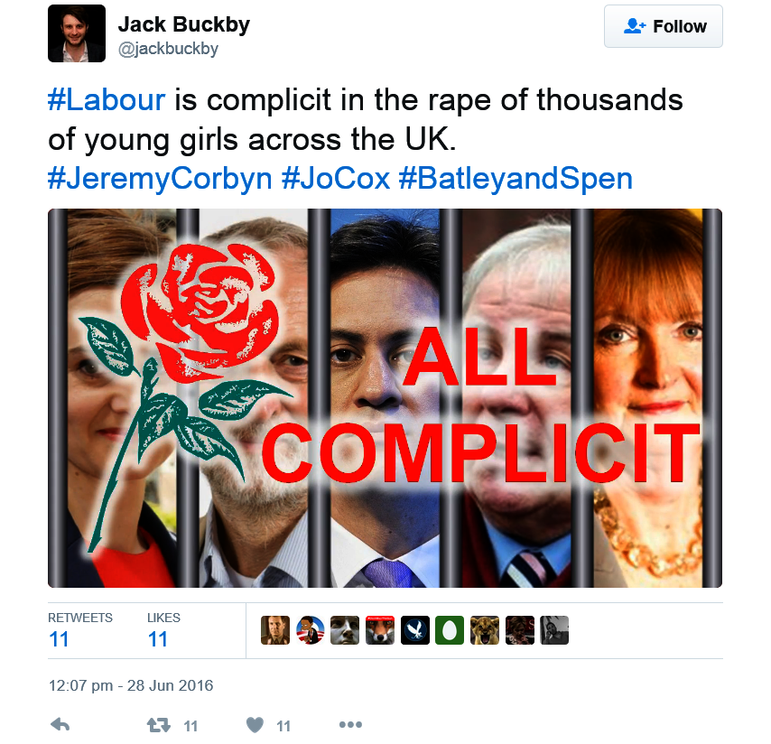 Jack Buckby, the neo-Nazi ex-BNP candidate standing on his own against the Labour candidate in the Batley and Spen parliamentary constituency, has sickeningly tweeted appalling lies about the murdered MP, horrifically and absurdly accusing the late Labour MP Jo Cox of being "complicit in the rape of children", using her picture in a vile smear video shared on social media. The shameless LibertyGB candidate thrown out of university in Liverpool for his fascist activities, crudely exploits Jo Cox's death with a stomach-churning lie, spitting bile on the grave of the recently murdered MP, untruthfully linking the late MP with the child sex abuse scandal of Rotherham. The suspect in Jo Cox's murder, Thomas Mair, is currently detained awaiting trial in the autumn, the continued suffering of the Cox family heightened with Buckby's horrific and deceitful slur.