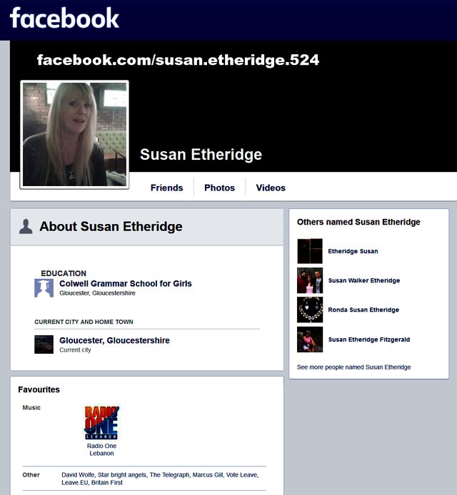 Ms Etheridge's Facebook account locates her as a Gloucester resident. Her "likes" include Britain First along with Vote Leave!