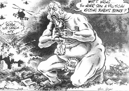 In the cartoon, published on 27 January, Sharon says "What's wrong? You never seen a politician kissing babies before?" as a loudspeaker from a helicopter gunship chants "Vote Sharon, Vote Sharon" overhead. The cartoon was based on Goya's Saturn Devouring His Children and was penned after a pre-election raid by Israeli missiles on Gaza City. The prize was presented after a vote by the members of the Political Cartoon Society and national newspaper cartoonists. It was presented by the former cabinet minister Clare Short on Tuesday night at the headquarters of The Economist in London.