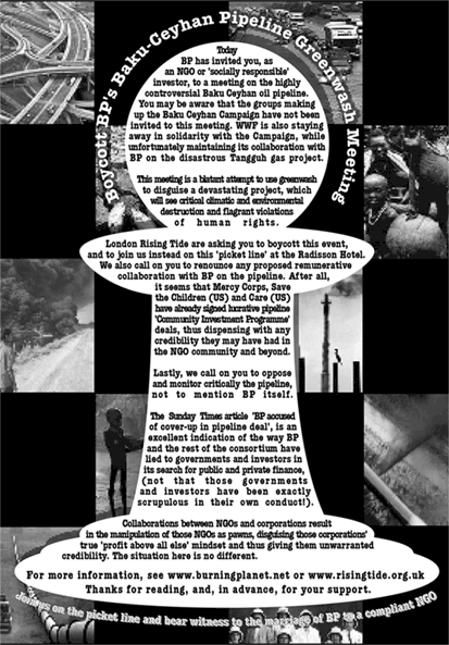 Meanwhile outside, a small, hardy and creative bunch of London Rising Tiders had assembled at the doorway, studiously ignoring police attempts to corral them into a pathetic crash barrier-surrounded 'free speech area' across the busy road. Some unravelled a banner which had up to now read 'Oil Fuels Climate Chaos', but which had been modified ingeniously to read 'NGOs Fuel Climate Chaos' for the day. Others gave out leaflets covered in images of the true impact of our oil use, with the text crafted into the shape of a pawn, which was what those accepting BP's invitation surely were.