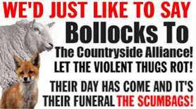 finally, the CA encourage the polarisation of town/country. much like black/white, straight/gay and so on. in truth these are on and the same and neither exists truthfully. a town can have many parks, allotments, wilderness ground, trees and so on. the countryside can also, likewise be a barren, lifeless wilderness with barely a living thing growing. see though the subconcious core of their lies. they would set us against each other. they fooled those who turned up at the pro-hunt demo (think how many would turnm up to london mass demos if the anti-war movement could afford to rent a nationwide fleet of buses, the CA practically pay people to go to these demos), they didn't fool the majority of us.