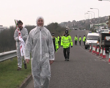 They were arrested under Section 14 of the Public Order Act for failing to comply with the conditions of a police order restricting them to a certain area and limiting the time of the demonstration.