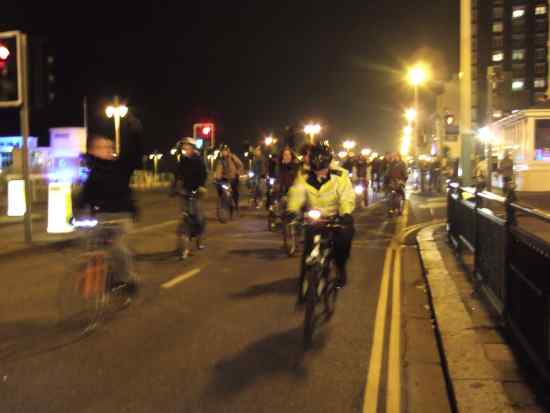 Although this may seem like typical behaviour, this is a recent emergence on the Brighton Critical Mass. Previously police had kept in the background and allowed the mass to safely cycle the streets. Their recent behaviour has caused the group to be segregated, leaving cyclists vulnerable to traffic. Feb saw the police halt the whole prosetion outside brighton station for 15mins claiming they were not allowed access to the public space. One officer informed a cyclist "you can't try your civil liberty crap with us". What could have tacken minutes to pass, caused major traffic jams which were then blamed on the protestors (of course).