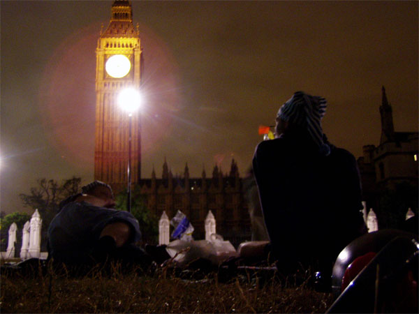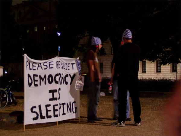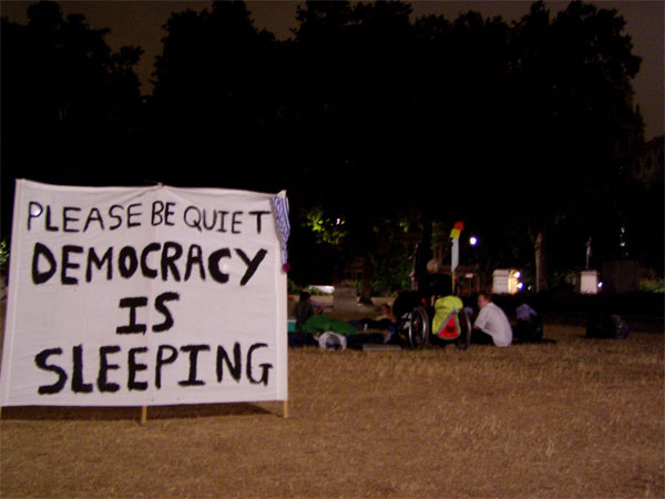 they gathered from about 8pm, and despite the large banner "democracy is sleeping" the protestors were left unhassled overnight, but had a visit from community support officers this morning around 9.30am who were asking whether their demonstration was authorised. they left, suggesting that police may attend later on. any developments will be posted here.