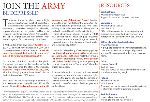 http://tinyurl.com/l7zva) 5.Iraqi body count 6.The Lancet Report (www.thelancet.com) 7.Crisis homeless charity - www.crisis.org.uk 8.combatstress.org.uk 9.”Ex-soldier kills family”, BBC 9th July - www.tinyurl.com/mu9ga 10. www.endabuse.org or www.womensaid.org.uk 11. ”50% of women murdered suffered domestic abuse”, House of Commons debate, www.tinyurl.com/nhbfl ---