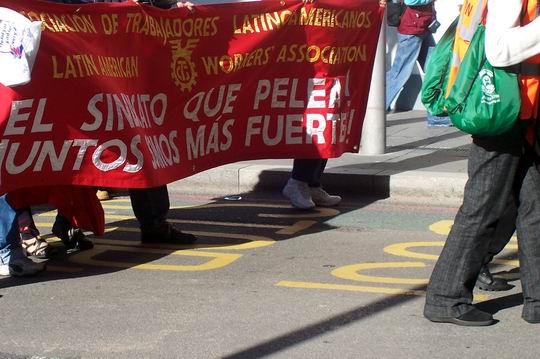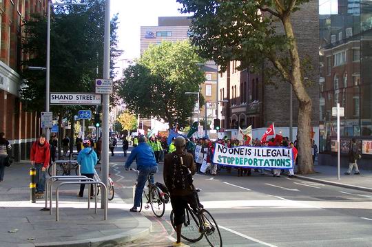 13:35 Demo is well on its way, with at least 500 people now, many families amongst them. The police is very low-key. Reports emphasise the mixedness of the crowd. "Justice for cleaners" have brought a banner of the Transport and General Workers Union. The noborders london banner demands "freedom of movement for all". Barbed wire Britain calls to "end detention centers for immigrants". The no sweat campaign is there as well as the Black African Minorities group and many people with smaller placards saying "no one is illegal" or "open borders". Lots of Latin Americans are walking at the start of the march, there is a banner of the Latin American Workers Association. Socialist groups are shouting slogans. At the back is "the autonomous lot" with a pink noborders banner. The march ends with an anarchist banner stating "The state is the only terrorist."