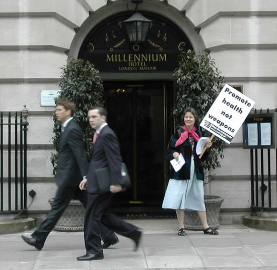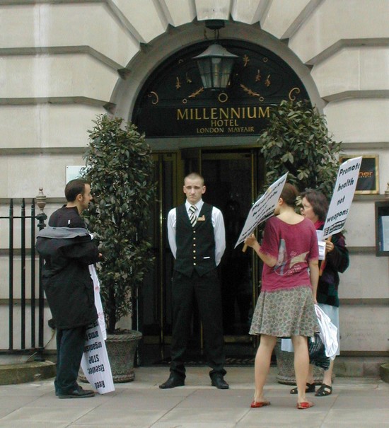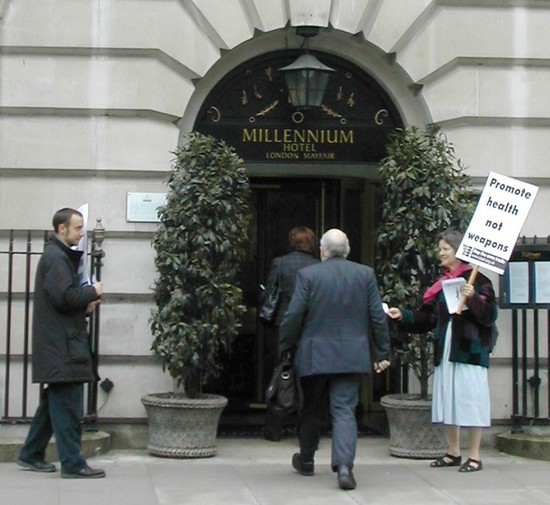 2. Today's AGM took place at the Millenium Hotel in Grosvenor Square, London. The demonstration, which was entirely peaceful and lawful, was organised by CAAT with the support of healthcare students' group Medsin.