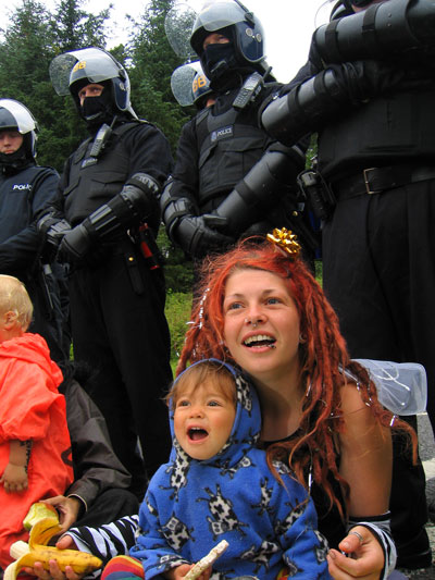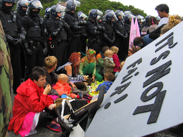 The kids' bloc organised their own blockade on a road close to the Gleneagles hotel and had a picnic at the feet of the Scottish riot police, successfully preventing the Canadian delegates from reaching the summit meeting with George Bush and Tony Blair.