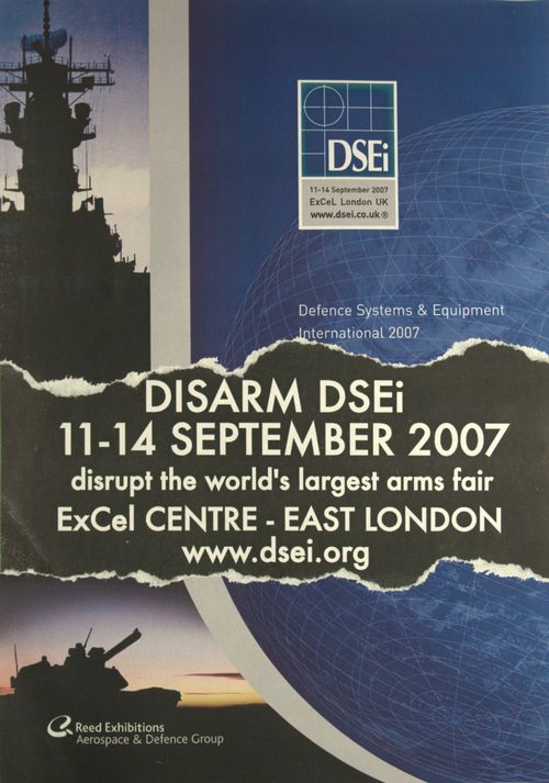 In 2005, DSEi hosted 1,200 companies, 70 official military delegation and 20,000 visitors from across the globe. Many of the countries invited were at war, some with each other. Many were dictatorships with appalling human rights records. Many had huge national debts with populations in severe states of poverty and starvation. We must not let them meet without disruption and opposition. Join us and take action. Say no to war. Say no to the arms trade.