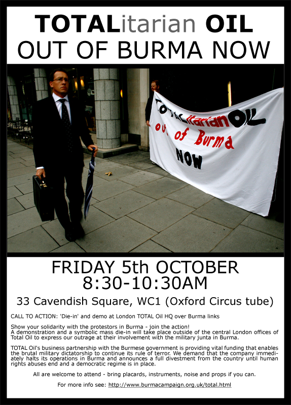 As the streets of Burmese cities are patrolled by soldiers and thousands of monks and protesters are still missing after having been killed, beaten up or arrested during last week’s demonstrations, support for the Burmese people’s struggle is vital. With thousands taking to the streets on Sunday, it is also important to expose those who make the military dictatorship possible – corporations such as Total Oil. Aung San Suu Kyi, the most respected figure of Burma’s democracy movement, has identified Total as “the biggest supporter of the military regime in Burma”, earning the junta hundreds of millions of dollars each year. Total’s joint venture with Burma’s rulers in the Yadan gas project in the south of the country provides crucial revenues to the regime and has had its own horrific record of human rights abuses such as the use of forced labour and widespread torture and rape against those who oppose the project.