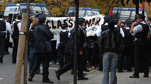 Police took advantage of the gloomy deserted streets to behave as you'd expect. Enforcing a policy of forcing suspected sympathisers into the demonstration they targeted a man with a broken arm, twisting it until he fell screaming to the ground. Using they ensuing crowd reaction ("scum, scum") as an excuse they violently arrested two women at the kettle in Oxford Gardens.