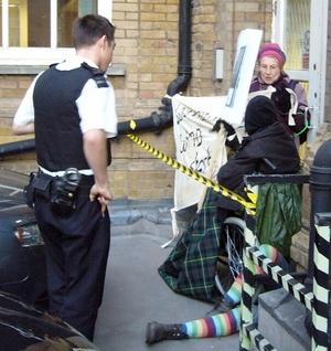 A crowd of workers and visitors trying to gain access to the building had gathered on the pavement within a quarter of an hour. Several accepted leaflets. Belgravia police were called to deal with the protesters. There was a delay as the police awaited bolt-cutters and back-up, but the chains were eventually removed from the front door, after which the protesters blocking the back entrances, including an elderly lady in a wheelchair, decided to unchain the doors and move round to the front. Police were admitted to the building for discussions, but no arrests were made (either of the peace campaigners or the arms dealers). The protesters were allowed to continue demonstrating and leafleting peacefully outside the building, until finally leaving of their own accord at 9.30am.