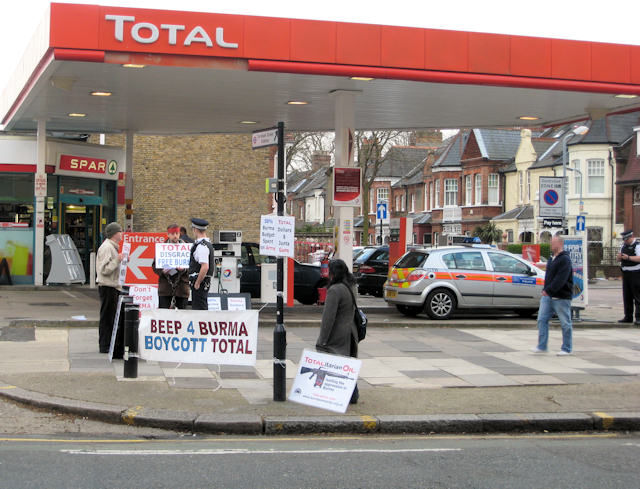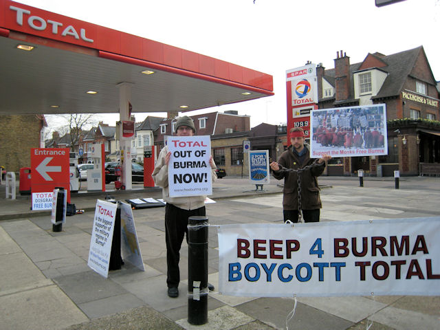 Our next big protest is the global day of action against TOTAL on May 16th. Every year TOTAL gives the Burmese regime $500 million through its gas platform in Burma. Since around 1/2 of the regime's money is spent on the army and its violent campaigns of repression it is fair to say that TOTAL is funding repression in Burma. We're aiming to hold protests at TOTAL Garages across Europe on May 16th, why not join us? Below are the 3 steps to holding your own protest: