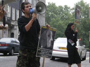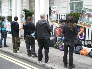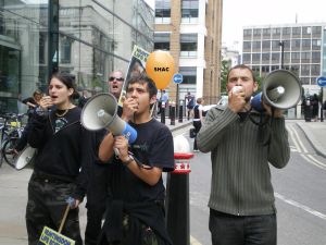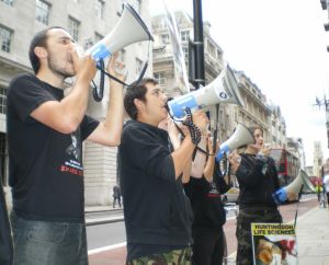 With about 18 of us, we arrived at Old Mutual. We hadn't demonstrated for more than about 5 minutes before a couple of members of SHAC were invited into the building to talk about why we were there. A most welcome change from almost all the other companies who generally order more security to prevent a dialogue taking place. Obviously Old Mutual are a bit wiser and haven't been coerced by the mass media into thinking we're unreasonable people. After a constructive talk with a couple of senior members of staff, we explained what we wanted (them to sell HLS shares) and explained that the demonstrations would continue until they do. The tone of the whole conversation was very positive though and it would not be a surprise if these shares were sold in the near future. We still proceeded to demonstrate at Old Mutual, explaining the horrors of Huntingdon Life Sciences. We stayed about an hour and a half.